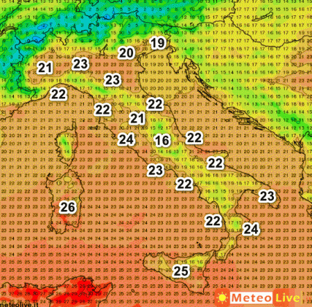Temperature nel complesso gradevoli. Da segnalare 26° nel sud della Sardegna e 25° in Sicilia.