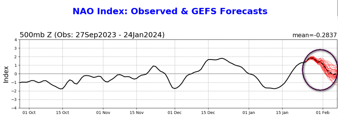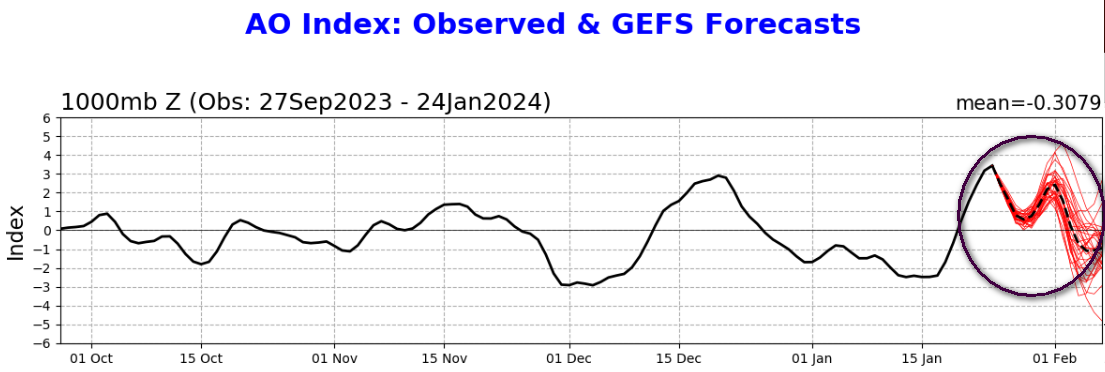 C’è allora qualche possibilità che l’anticiclone possa levare il disturbo durante la prima decade di febbraio? Disturbi ce ne saranno sicuramente, perché gli indici teleconnettivi li segnalano ancora: l’AO che monitora la salute del vortice polare troposferico, dopo un ultimo picco al primo febbraio, è previsto in calo anche marcato: