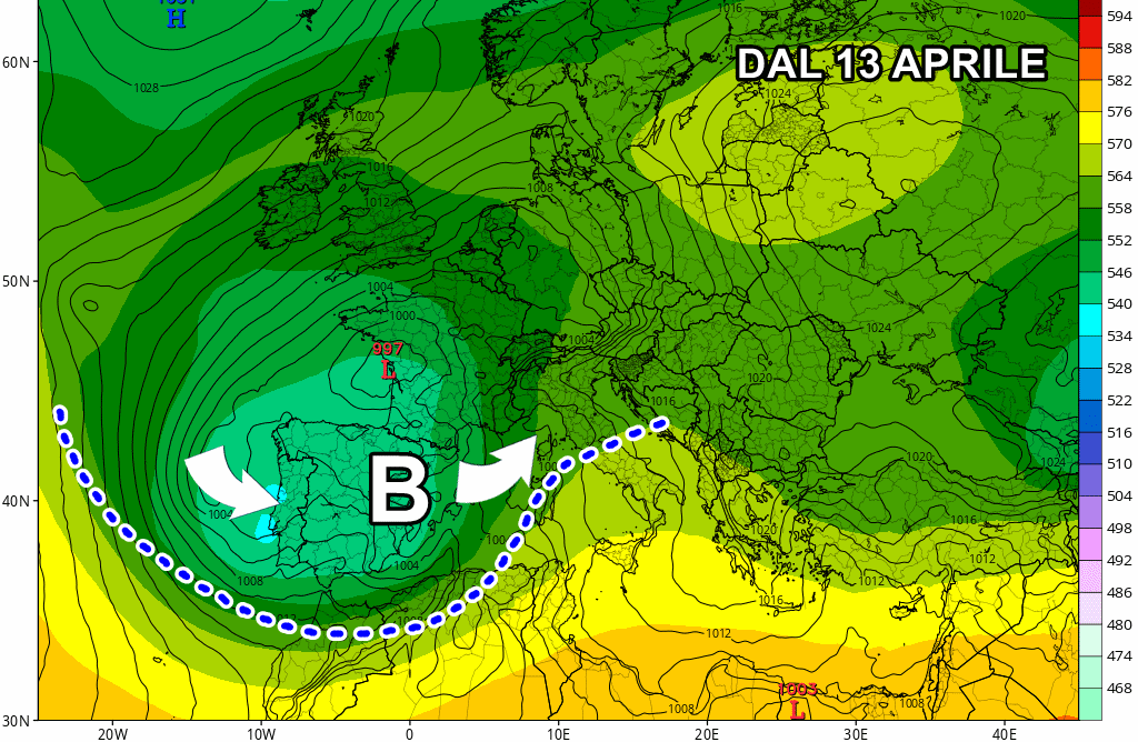 Eloquente la dinamica prevista dal modello europeo ECMWF attorno a metà aprile: questa configurazione potrebbe determinare una severa fase di maltempo al Nord, sul medio-alto Tirreno e sulla Sardegna, dove gli impetuosi venti di Scirocco andrebbero a innescare violenti temporali, anche a carattere stazionario.