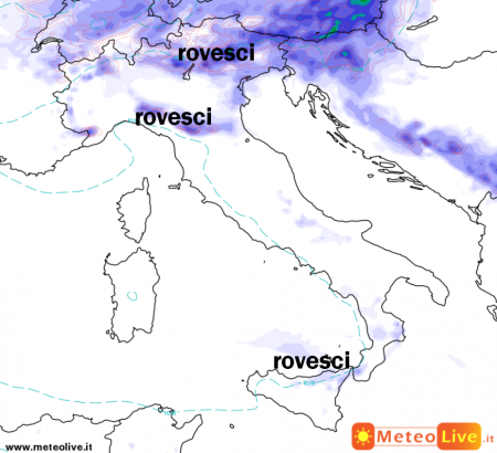 SITUAZIONE: una perturbazione si avvicina alle Alpi ma l’opposizione dell’alta pressione ne impedirà un franco ingresso sul settentrione, limitato ad annuvolamenti e rovesci temporaleschi su Alpi, nord-est e sul nord Appennino nel pomeriggio-sera, nel contempo una linea di instabilità ha raggiunto il medio-basso Tirreno e nelle prossime ore potrebbe determinare rovesci tra Sicilia e Calabria, come vediamo dalla mappa riassuntiva del tempo previsto per oggi: