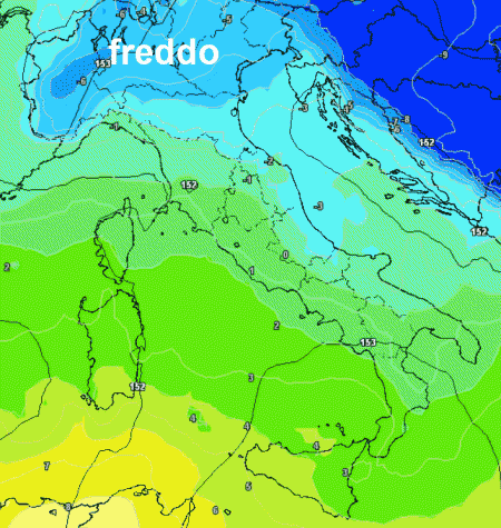Ecco una mappa che certifica il rientro dell’aria fredda sul settentrione nella notte tra sabato e domenica, con valori sino a -6°C a 1500m:
