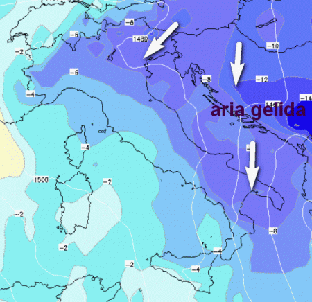 ARIA GELIDA: una massa d’aria gelida si porterà giovedì dal centro Europa verso il settore balcanico-danubiano sino a coinvolgere in parte le nostre regioni dalla serata, irrompendo come venti di Bora e Tramontana ed abbassando sensibilmente le temperature soprattutto in Adriatico, qui una mappa termica prevista per la mattinata di venerdì 15 gennaio secondo il nostro modello: