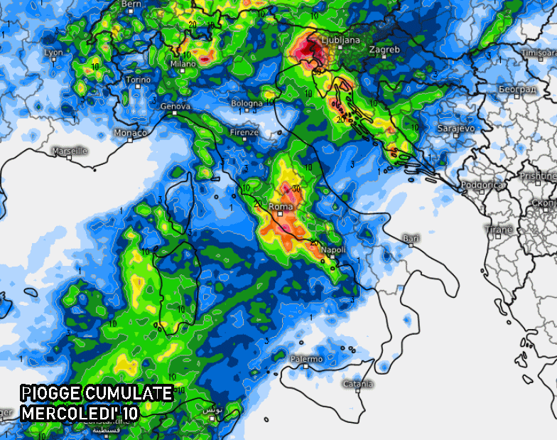 Ancora maltempo è previsto nella giornata di mercoledì su molte più regioni, poiché il fronte freddo tenderà a muoversi verso est, inglobando il nord-est e gran parte delle regioni centrali. Rischio fenomeni intensi su Friuli Venezia Giulia (oltre 80-100 mm di pioggia), Umbria, Lazio e Campania (dove potrebbe transitare un temporale auto-rigenerante molto forte).