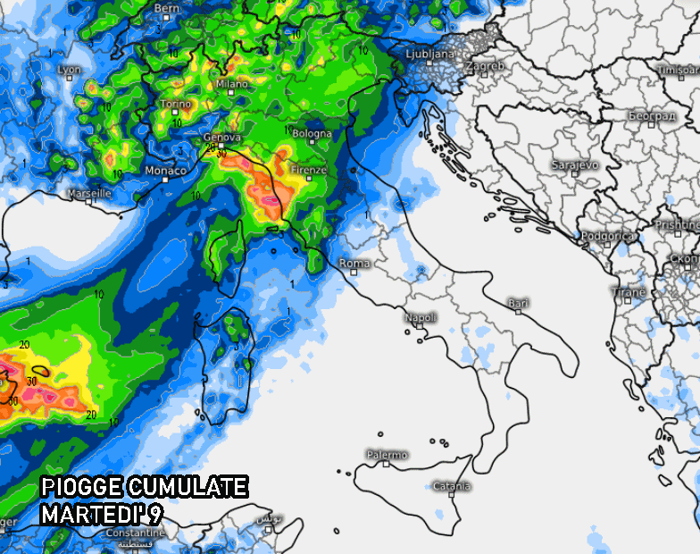 Eloquente la previsione delle precipitazioni attese martedì, soprattutto a ridosso dei monti del Nord Italia e tra Liguria e Toscana. Avremo accumuli diffusi tra i 10 e 30 mm, ma non si escludono picchi localmente superiori ai 100 mm (specie su genovese, spezzino, alta Toscana, livornese) in presenza di temporali stazionari, certamente i più temibili in termini di rischio idrogeologico.