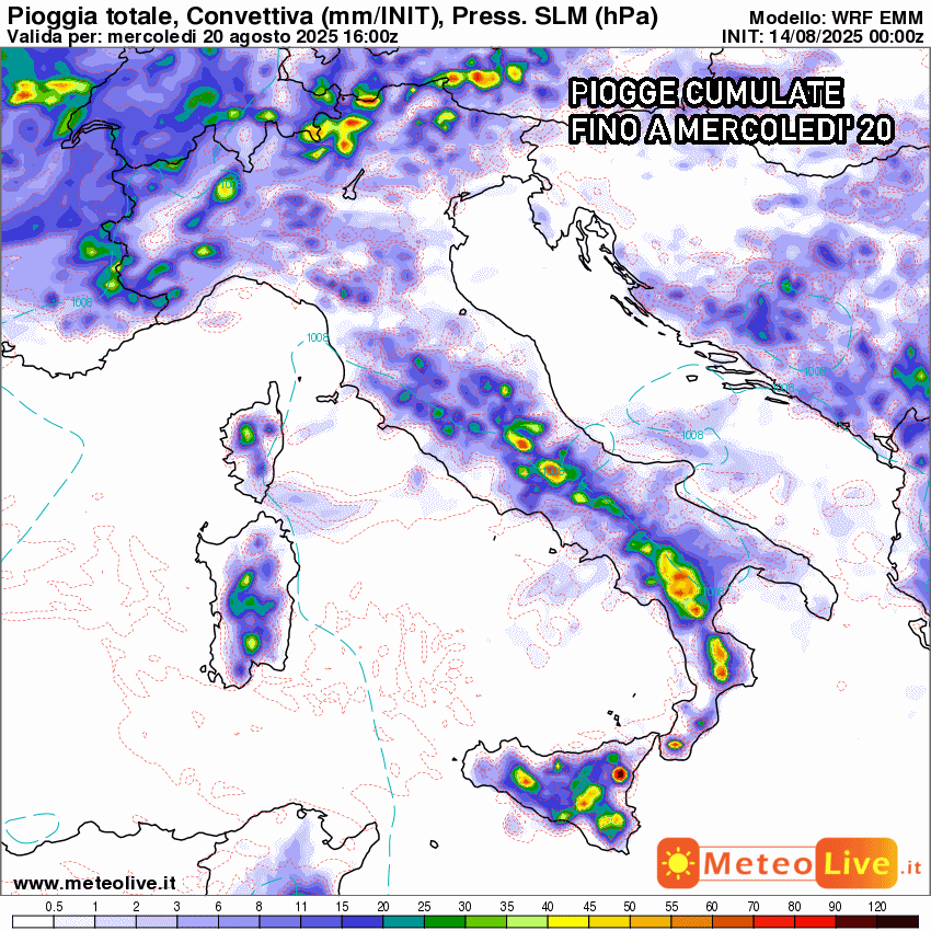 All’interno di quest’area depressionaria si sviluppano con facilità i tipici temporali di calore nelle zone interne collinari e sui monti del centro-sud Italia. Nel corso di questo venerdì si prevedono numerosi fenomeni, per un Ferragosto turbolento su gran parte delle aree interne del centro-sud e localmente anche sulle coste, come ad esempio sulla Puglia ionica, la Calabria e la Sicilia settentrionale.