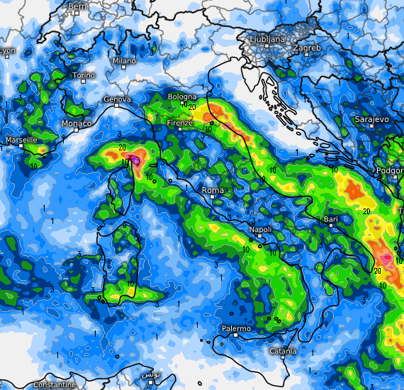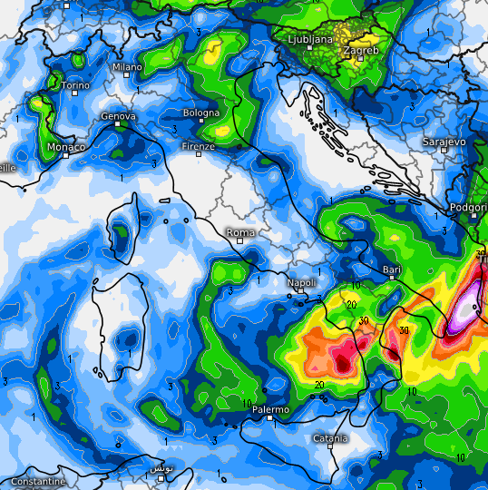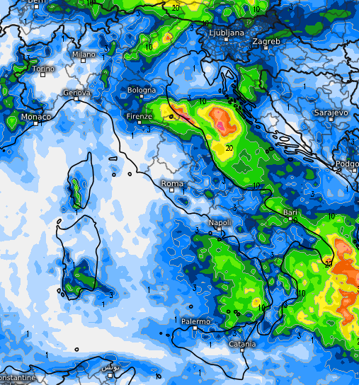 Le conseguenze sul territorio le vediamo da questa mappa che certifica gli accumuli di pioggia previsti proprio per martedì 17 sull’Italia dal modello GFS, che vede fenomeni anche rilevanti al sud e sull’alto Adriatico :