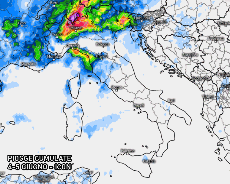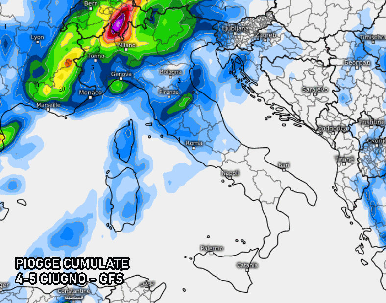Come si evince dalle piogge previste dal modello americano GFS, tra il 4 e il 5 giugno potrebbero precipitare punte di oltre 100 mm di pioggia, soprattutto sull’alto Piemonte e la Lombardia nord-occidentale. A ridosso dei monti, le precipitazioni potrebbero rivelarsi molto più sostanziose ed inoltre non si escludono temporali persistenti in grado di generare pioggia a carattere di nubifragio per diverse ore consecutive sui medesimi settori.