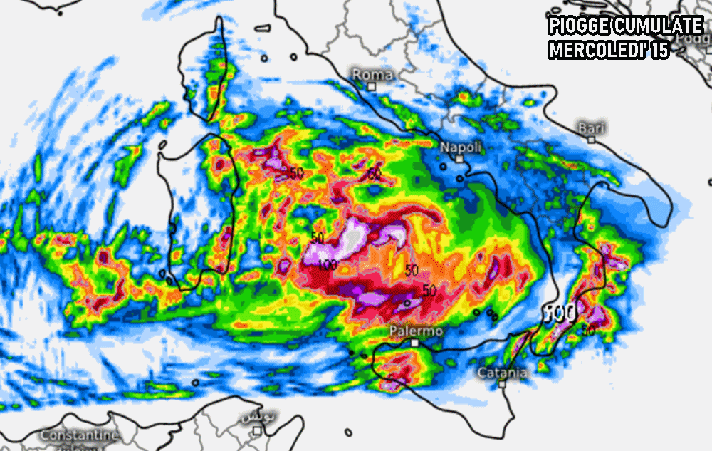Il maltempo entrerà nel vivo durante la giornata di mercoledì 15 ottobre, quando il ciclone si piazzerà nel cuore del Mar Tirreno e si rinforzerà rapidamente, fino a coinvolgere gran parte del Sud Italia. Si prevedono precipitazioni diffuse sulla Sardegna orientale, sul Sud Sardegna, su buona parte della Sicilia e soprattutto sulle coste del basso Tirreno, dal Lazio alla Calabria. Le piogge potranno rivelarsi particolarmente intense su Palermitano, Ogliastra, Olbiese, Napoletano e Calabria tirrenica.
