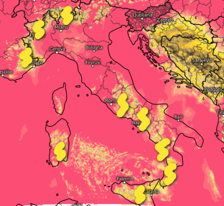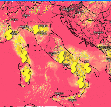 Ecco i temporali anche forti che si svilupperanno indicativamente dal Lazio verso sud. Fenomeni più intensi nelle aree interne, ma con possibili sconfinamenti lungo le coste specie del Tirreno e delle Isole. Sul resto d’Italia soleggiato a parte qualche temporale sulle Alpi in serata.