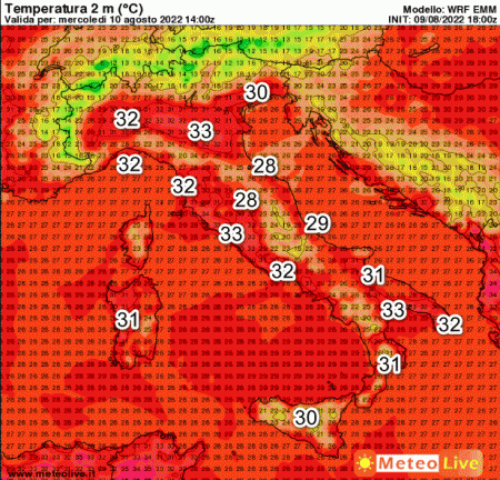 Temperature quasi ovunque superiori a 30°, ma senza punte eccessive. Relativamente più fresco il versante adriatico e le aree interne.