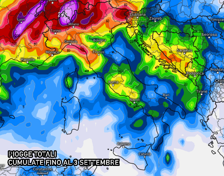 Eloquente la mappa che ci indica le piogge totali previste nei prossimi 10 giorni sulla nostra penisola. La somma delle due perturbazioni ci propone accumuli pluviometrici davvero importanti per il Nord Italia, soprattutto per i settori montuosi dove cadrebbero ben oltre 150/200 mm di pioggia totali, come ad esempio sull’alto Piemonte e alta Lombardia. Piogge e temporali colpirebbero anche le regioni centrali, specie quelle del versante tirrenico più esposte alle correnti instabili da ovest.