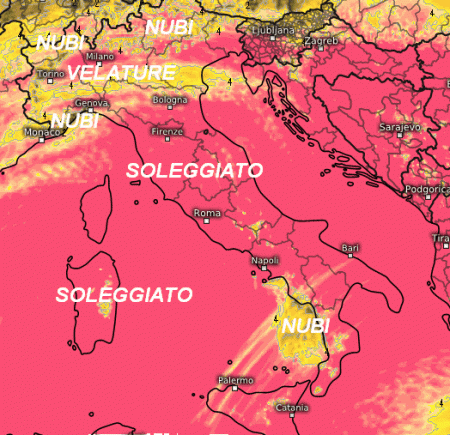Un po’ di velature al nord con nubi su Alpi e Liguria centro-occidentale senza piogge. Nubi anche tra il Cilento e la Calabria Tirrenica, sempre senza piogge, per il resto soleggiato e stabile.