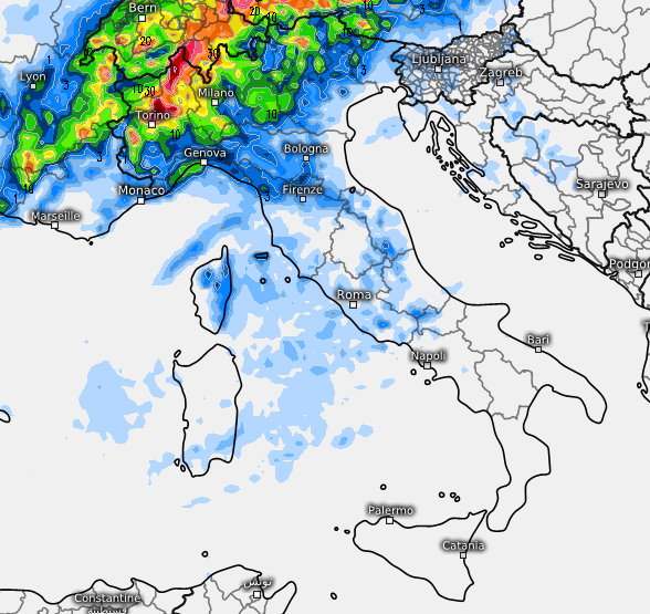 La mappa sopra è relativa all’alba di domenica 8 luglio: c’è da aspettarsi qualche temporale su Alpi e regioni di nord-ovest, come mostra la mappa seguente (accumuli ancora localmente preoccupanti su alto Piemonte):
