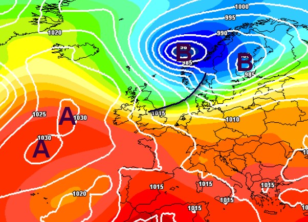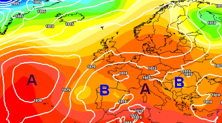 Si nota l’anticiclone delle Azzorre in pieno Atlantico ad ovest ma che si distende anche sin sul centro Europa, stringendo un patto d’acciaio con quello africano che si protende come una lingua dal nord Africa all’Italia e sin sul centro Europa.
