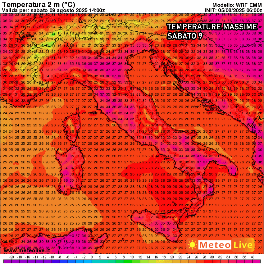 Eloquenti le temperature massime previste per sabato 9 agosto: si prevedono picchi di 35 o 36°C su diverse località della Val padana e nelle aree interne del centro sud. Molto localmente la colonnina di mercurio potrebbe spingersi ancora più in alto tra Basilicata, Calabria, Sicilia e Sardegna, tanto da sfiorare 37 o 38°C. Insomma, già parliamo di temperature abbondantemente superiori alle medie del periodo e ben distanti da quelle che sarebbero le tipiche temperature dell’estate mediterranea, come quelle che stiamo vivendo tuttora.