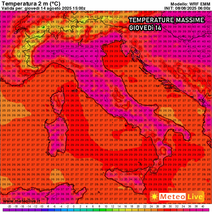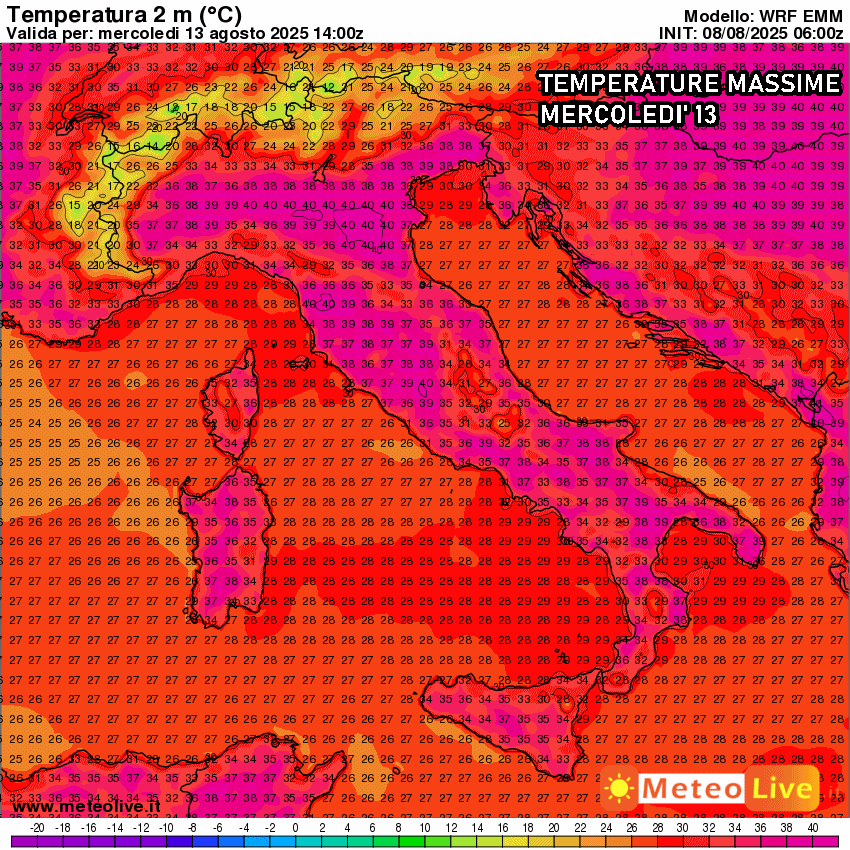 Mercoledì 13, il caldo arriverà a punte di 38–40 °C in Toscana, Lazio e Umbria, con Firenze, Roma e Perugia in prima linea per le alte temperature. Situazione simile in Val Padana dove si toccheranno i 38 °C, o addirittura localmente 39-40°C, valori che sarebbero decisamente esagerati ed eccezionali. Al Sud, si sfioreranno i 40–41 °C nelle conche interne di Sicilia e Calabria, con Catania e Foggia in prima linea.