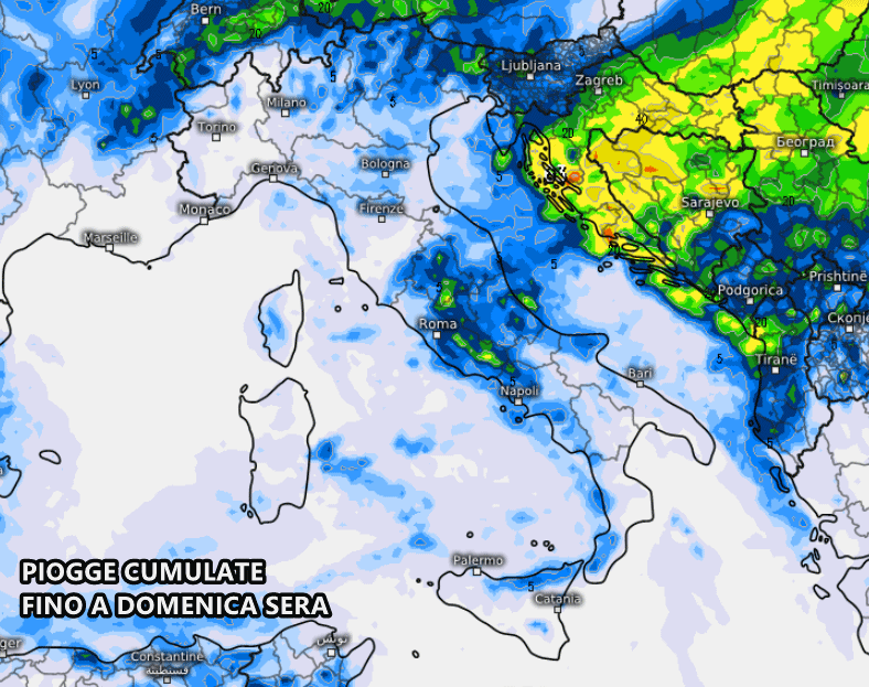 In verità non ci sarà tanto maltempo: fino a domenica sera sono previsti accumuli discreti solo al centro Italia, con punte di 20-30 mm, per il resto troviamo accumuli rari e blandi. Domenica infatti sarà una giornata soleggiata quasi ovunque, eccetto isolati acquazzoni sulle coste adriatiche dalle Marche alla Puglia.