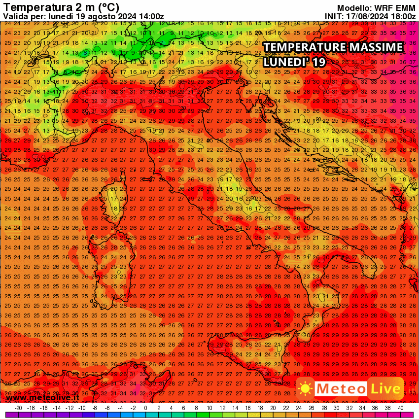 Le massime previste lunedì sono di gran lunga inferiori rispetto ai giorni, specie al centro e al sud. Addirittura laddove avremo a che fare con rovesci e temporali, anche in pieno giorno, è molto probabile che la temperatura scenda ben al di sotto dei 23-24°C. Il ritorno del Sole al nord, domani, permetterà ai termometri di registrare picchi oltre 30°C, ma in un contesto nettamente più sopportabile rispetto ai giorni scorsi.