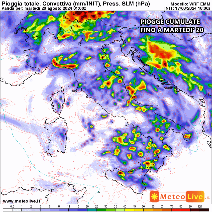 Man mano che la depressione si approfondirà nel cuore del mar Tirreno, avremo un sensibile peggioramento su gran parte del centro Italia, sul Triveneto ed infine anche al sud. Entro la sera di lunedì ci aspettiamo accumuli pluviometrici modesti e a tratti sostenuti sulla Liguria di levante, sul versante adriatico e anche in Calabria. Nelle aree evidenziate in rosso o arancio possiamo notare la presenza di piogge più forti, anche a carattere di nubifragio a sfondo temporalesco.