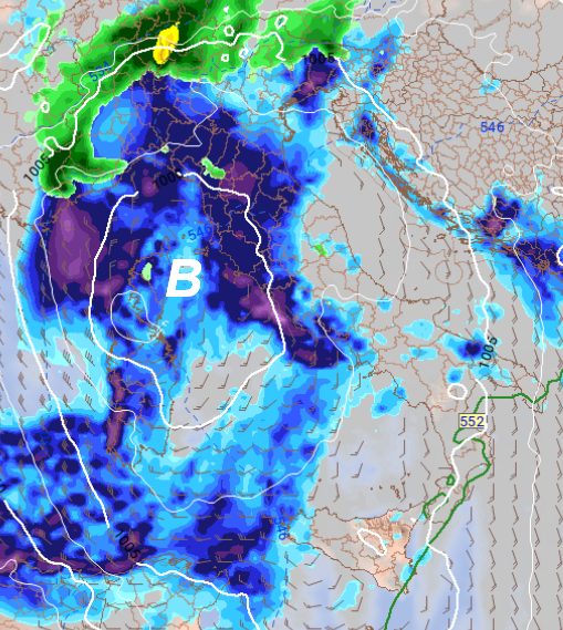 Invece il guasto tra il 5 e il 6 gennaio, messo in evidenza da più modelli, potrebbe risultare più marcato, originando precipitazioni in parte anche abbondanti, mediamente nevose sulle Alpi oltre i 1300m, in Appennino solo oltre i 1500-1600m, qui di seguito il quadro barico e le conseguenze precipitative nella notte tra il 5 e il 6 gennaio 2024:
