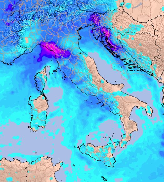 Notate il picco di pioggia tra Levante Ligure ed alta Toscana, il limite della neve si attesterà mediamente oltre i 1200-1300m. Passata la prima perturbazione, la seconda è appena abbozzata tra il 2 e il 3 gennaio, la vediamo qui, con conseguenze comunque piuttosto modeste, un po’ di pioggia passeggera, specie sul Tirreno: