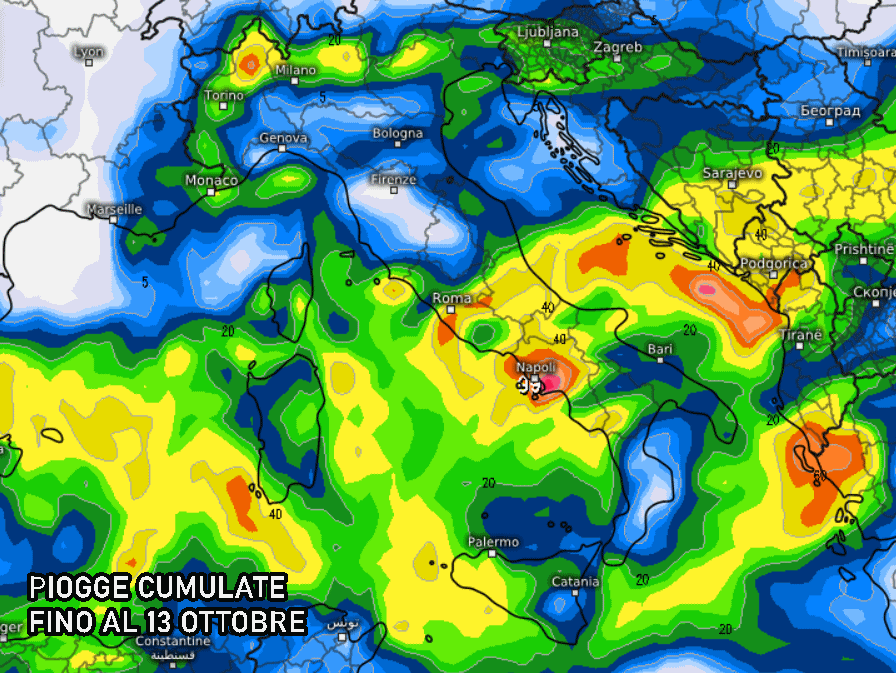 Le piogge totali previste nei prossimi 7 giorni mostrano un quadro piuttosto piovoso per l’Italia, ma specifichiamo che la maggior parte di queste precipitazioni potrebbero bagnare il Paese solo a partire dal 14 ottobre, eccezion fatta per Sardegna e Sicilia, che vedranno le precipitazioni già da questo venerdì.