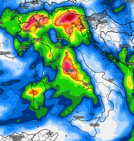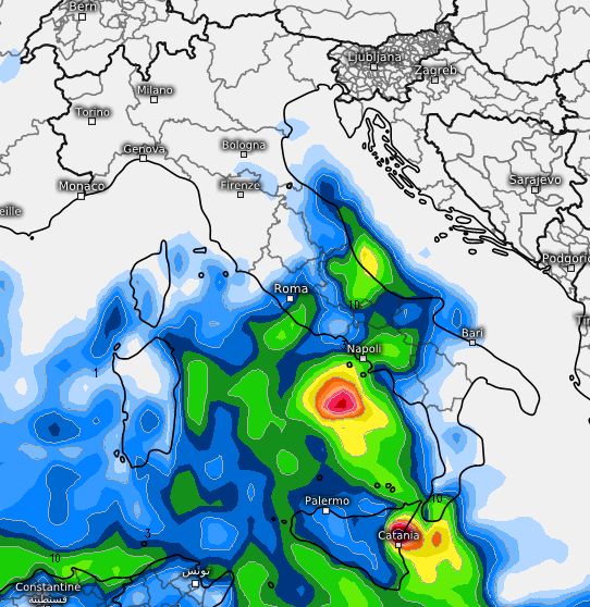 Si tratta della sommatoria dei fenomeni (modello GFS) previsti tra il 7 e il 10 novembre, ma è comunque una proiezione, l’affidabilità è dunque piuttosto bassa.
