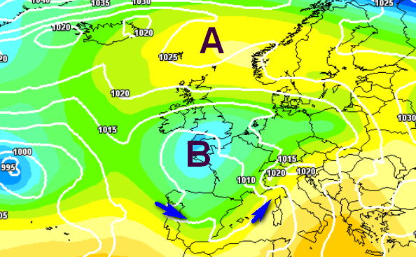 E non finirebbe nemmeno qui, perché poi si riaprirebbe la porta dell’Atlantico, cioè da ovest arriverebbero vortici depressionari in grado di determinare un ulteriore indebolimento dell’alta pressione e altre precipitazioni, come vediamo qui sotto (mappa prevista per il 15-16 novembre):
