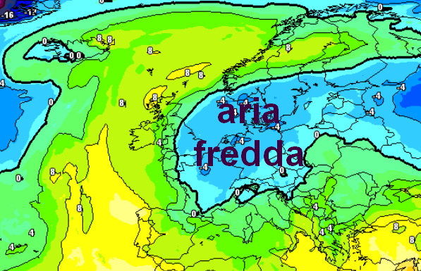 Ed ecco il quadro termico a 1500m, la neve sulle Alpi potrebbe cadere sin verso i 1000m, guardate come si potrebbe collocare l’isoterma di zero gradi: