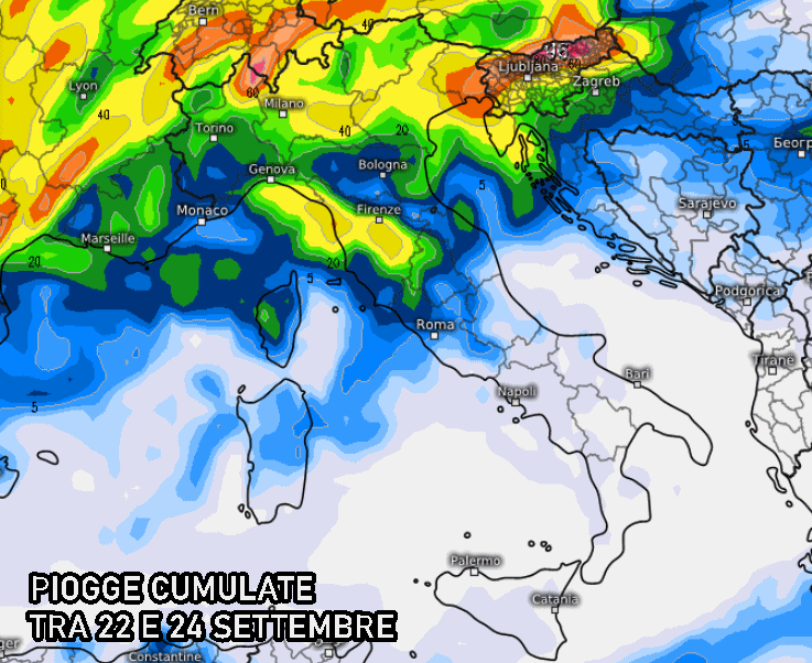 Questa perturbazione potrebbe incidere maggiormente sulle regioni del nord e localmente su quelle centrali, ma la traiettoria non è ancora del tutto chiara. Di seguito vi mostriamo le precipitazioni totali previste dal modello americano GFS tra il 22 e il 24 settembre, che stanno ad indicare il passaggio della perturbazione sul nostro Stivale.