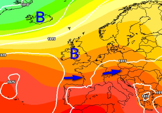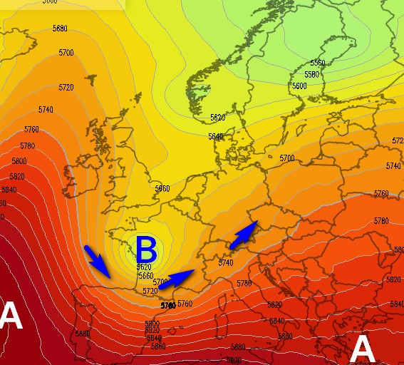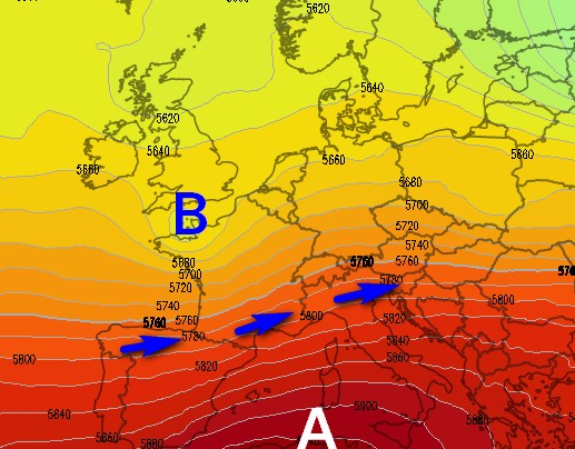 Nei giorni successivi secondo il modello GFS l’anticiclone perderà colpi e gradualmente da ovest si inserirà un cavo d’onda sul settentrione, foriero dei primi temporali sparsi, come si vede da questa carta barica: