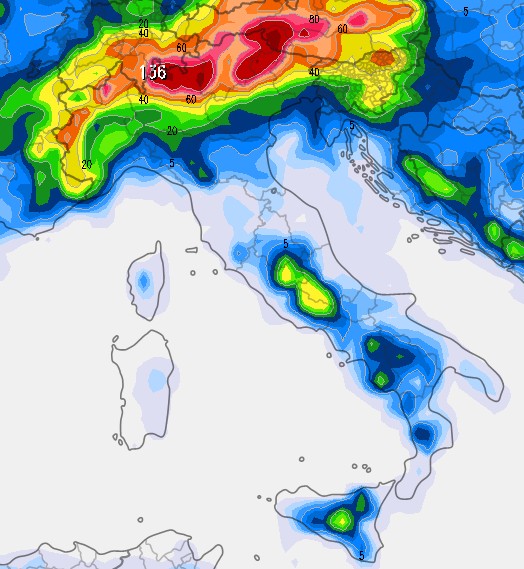Vediamone allora le conseguenze sul piano precipitativo con una mappa che riassume gli accumuli di pioggia dal 12 al 21 agosto (gli accumuli al centro-sud e sulla Sicilia verranno originati dai probabili temporali di martedì 12 sulle zone interne) mentre al nord nell’arco di 9 giorni potrebbero accumularsi sulle zone alpine anche 136mm di pioggia, in seguito a possibili nubifragi: