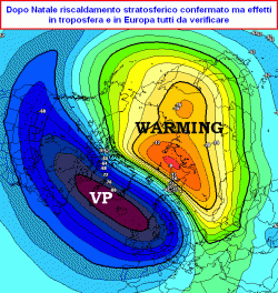 STRATOSFERA: il riscaldamento da più giorni preventivato sull’area siberiana è confermato per il periodo natalizio, ma nei giorni successivi tale riscaldamento potrebbe raggiungere il nord America da ovest costringendo il vortice polare a ripiegare in Europa, e questo di per sé non è un segnale di freddo in arrivo per il nostro Continente. Le dinamiche stratosferiche e i loro riflessi in troposfera, cioè nei bassi strati dell’atmosfera dove vive l’uomo non sono ancora del tutto chiare. Impossibile ad oggi pertanto stabilire se questo riscaldamento avrà ripercussioni opposte, cioè gelide, da gennaio in poi sul nostro Paese.