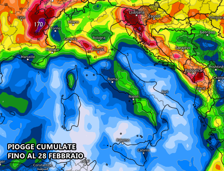 Il modello americano GFS mostrerebbe infatti un sensibile peggioramento del tempo sul finale del mese, grazie a correnti molto instabili nord-atlantiche, che, fiondandosi sul Mar Tirreno e sul Mar Ligure, potrebbero dare vita a un ciclone piuttosto insidioso. Questa depressione potrebbe generare tanta pioggia sul Nord Italia e sul medio-alto Tirreno, come indicato anche dalle precipitazioni totali previste entro la fine di febbraio: