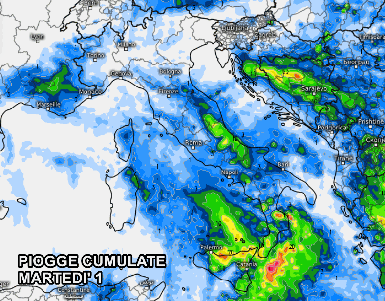 Anche la giornata di martedì risulterà un po’ turbolenta, con acquazzoni e temporali che riguarderanno soprattutto il centro-sud specie nel pomeriggio, ma che occasionalmente potranno svilupparsi anche sul nord-ovest sotto forma di brevi temporali. Inoltre, considerando che le temperature scenderanno di almeno quattro o cinque gradi sotto le medie del periodo, la quota neve durante i brevi temporali potrebbe assestarsi attorno ai 1.000 metri di quota su Alpi e Prealpi, e attorno ai 1.000-1.100 metri di altitudine lungo l’Appennino, con possibili sconfinamenti anche al di sotto in caso di rovesci intensi: