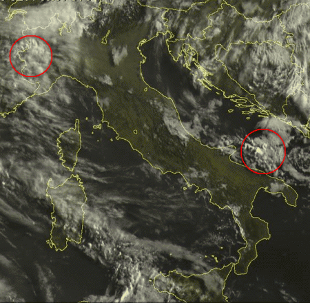 Due nuclei piovosi stanno agendo agli antipodi dell’Italia: il primo è sul Piemonte occidentale, il secondo al largo della Puglia. Su tutte le altre regioni il cielo è sereno o velato da nubi alte e sottili.