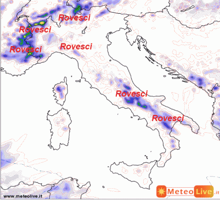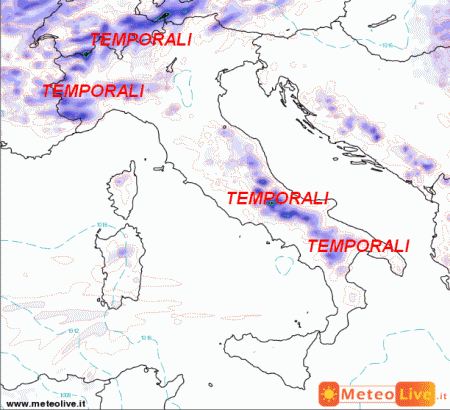 Rovesci o temporali su Alpi e Prealpi, specie la parte centro-occidentale, ma con possibili sconfinamenti sulle pianure adiacenti. Temporali anche sull’Appennino Ligure, Tosco-Emiliano e nelle aree interne del centro e del meridione, qui con qualche sconfinamento anche lungo le coste.
