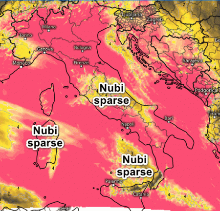 Soleggiamento buono su tutta l’Italia tranne nubi sparse su Sardegna, aree interne del centro e tra la Sicilia e la bassa Calabria, qui con qualche sporadico rovescio.