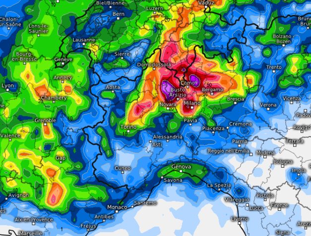 Ecco come il modello ECMWF “legge” le conseguenti precipitazioni, notate il picco inquietante sull’alta Lombardia, Milano compresa, l’alto Piemonte e il Canton Ticino: