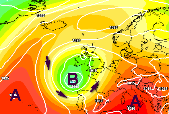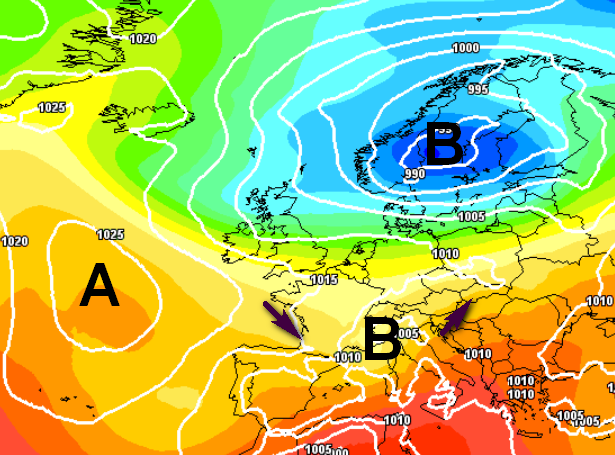 Con lo schema barico attuale invece le conseguenze sono quelle che vediamo qui sotto: