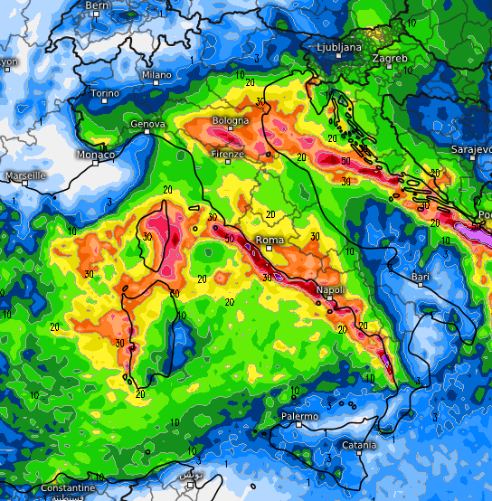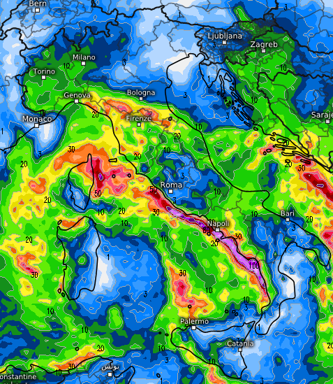 La distribuzione delle precipitazioni potrebbe cambiare radicalmente se la posizione del vortice non fosse quella prospettata. Al momento il rischio di situazioni alluvionali (anche del tipo “lampo”, cioè derivante da temporali marittimi che scaricano sulla costa e nell’immediato entroterra molti mm di pioggia in poche ore) si concentra ancora una volta all’Emilia-Romagna e poi sulla costa campana, dove si prevedono oltre 100mm in 24 ore di accumulo. Da monitorare anche la costa laziale (oltre 50mm in 24 ore, 90mm in 48 ore).