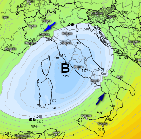 Cosa provocherà questa ondata di maltempo? Il vortice che andrà scavandosi sulle regioni centrali, come si nota in questa mappa a 5500m: