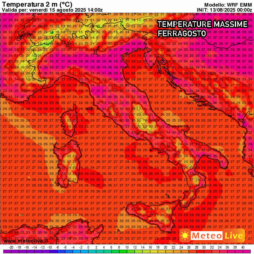 A Ferragosto l’instabilità si concentrerà solo su alcune regioni, mentre su tante altre splenderà il Sole e continuerà a far molto caldo. Eloquenti le temperature massime previste venerdì 15 agosto, con valori molto elevati su tutto il nord e centro Italia, con picchi di oltre 36 o 37 °. Farà un po’ meno caldo al sud, però dobbiamo tener conto anche della molta umidità che sarà presente su pianure e città costiere.