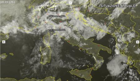 L’immagine satellitare che vi proponiamo in alto mostra chiaramente la presenza del campo di alta pressione nel Mediterraneo, in grado di portare cieli sereni al sud e tante nubi basse o nebbie sulle pianure e le coste del nord.