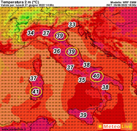 Punte di 41° nel sud della Sardegna, 40° sul Foggiano, 39-40° sulle Marche, l’Emilia Romagna e la Sicilia interna. Dove non avremo 40°, le temperature saranno ben al di sopra dei 35° tranne casi locali.