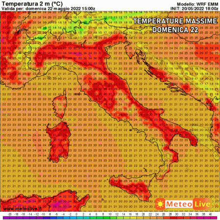 Eloquenti le temperature massime previste domenica 22 maggio: