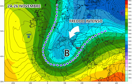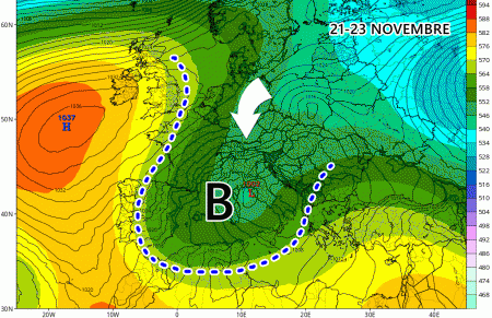 L’ondata di maltempo principale è prevista tra martedì 21 e giovedì 23 novembre: una massa d’aria fredda (in alta quota) darà vita a un ciclone nel cuore del mar Tirreno, il quale dispenserà piogge diffuse e locali nubifragi.