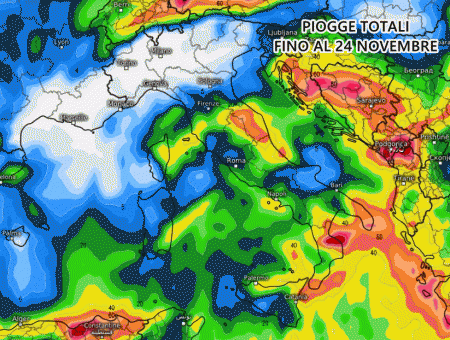 Centro e sud Italia saranno i settori più colpiti dal maltempo, mentre il nord rischia di trovarsi ai margini delle piogge, eccezion fatta per veloci fenomeni nel corso di martedì. Dalla mappa delle precipitazioni totali previste fino a giovedì 23, possiamo notare accumuli più abbondanti sul medio Adriatico e la Calabria (fino a 70-80 mm).