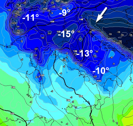 ONDATA DI FREDDO: l’azione del freddo si farà sentire maggiormente nel fine settimana, quando i valori a 1500m piomberanno anche sotto i -10°C, specie al nord e lungo l’Adriatico, che si tradurranno al suolo in valori attorno allo zero anche durante le ore centrali del giorno, ecco una mappa prevista dal modello americano per l’alba di domenica 14 febbraio a 1500m e potrebbero esserci conseguenze nevose sin sulle coste sul medio e basso Adriatico, sia pure di debole intensità:
