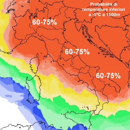 L’attendibilità di questa mappa è alta secondo il modello americano che segnala come elevata la probabilità di temperature inferiori a -5°C, come vedete nella mappa che segue che lo esprime in percentuale con una mappa di colori (colorazione rosso-marroncino indica alta probabilità), meno probabile solo sulle Isole Maggiori: